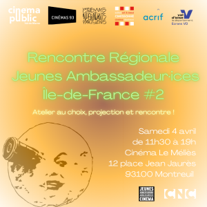 - Tout au long de l’année, les salles participantes accueillent des rencontres et ateliers avec des professionnel·les pour former les jeunes ambassadeur·ices à la programmation, la critique, l’animation de séance, la communication mais aussi la distribution ou encore sur la question de l’accessibilité.