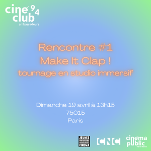 L’association propose aux membres du ciné-club 94 de participer à une demi-journée de tournage en immersion totale au studio Make It Clap ! Les participant·es vont découvrir le scénario sur place, tourner le court métrage en trois heures et ensuite regarder leur propre film sur grand écran.
